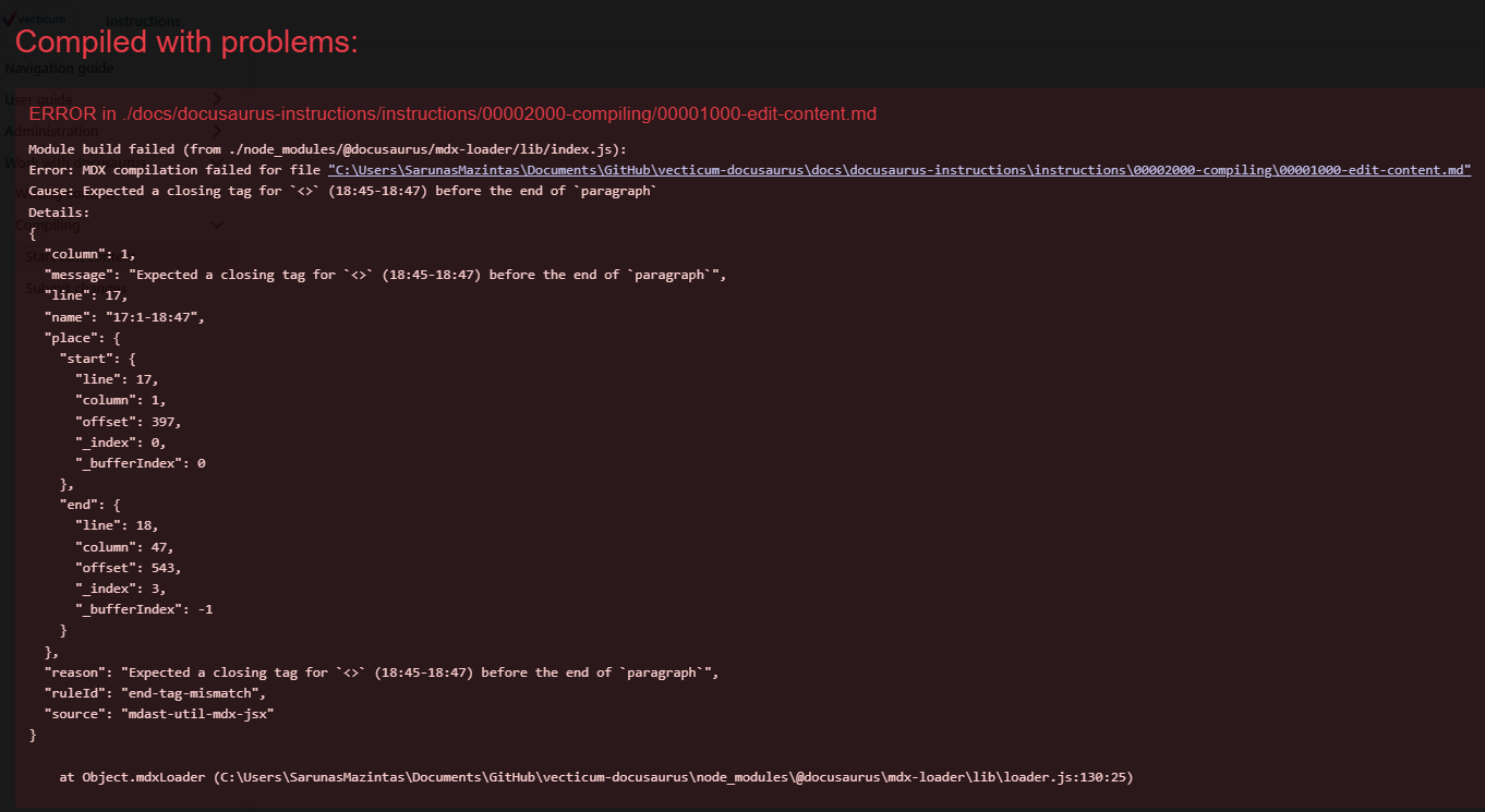 This error informs us that we made some changes that Docusaurus unable to understand. This error shows that symbols <> is found. You can fix this problem by escaping sensitive symbols.